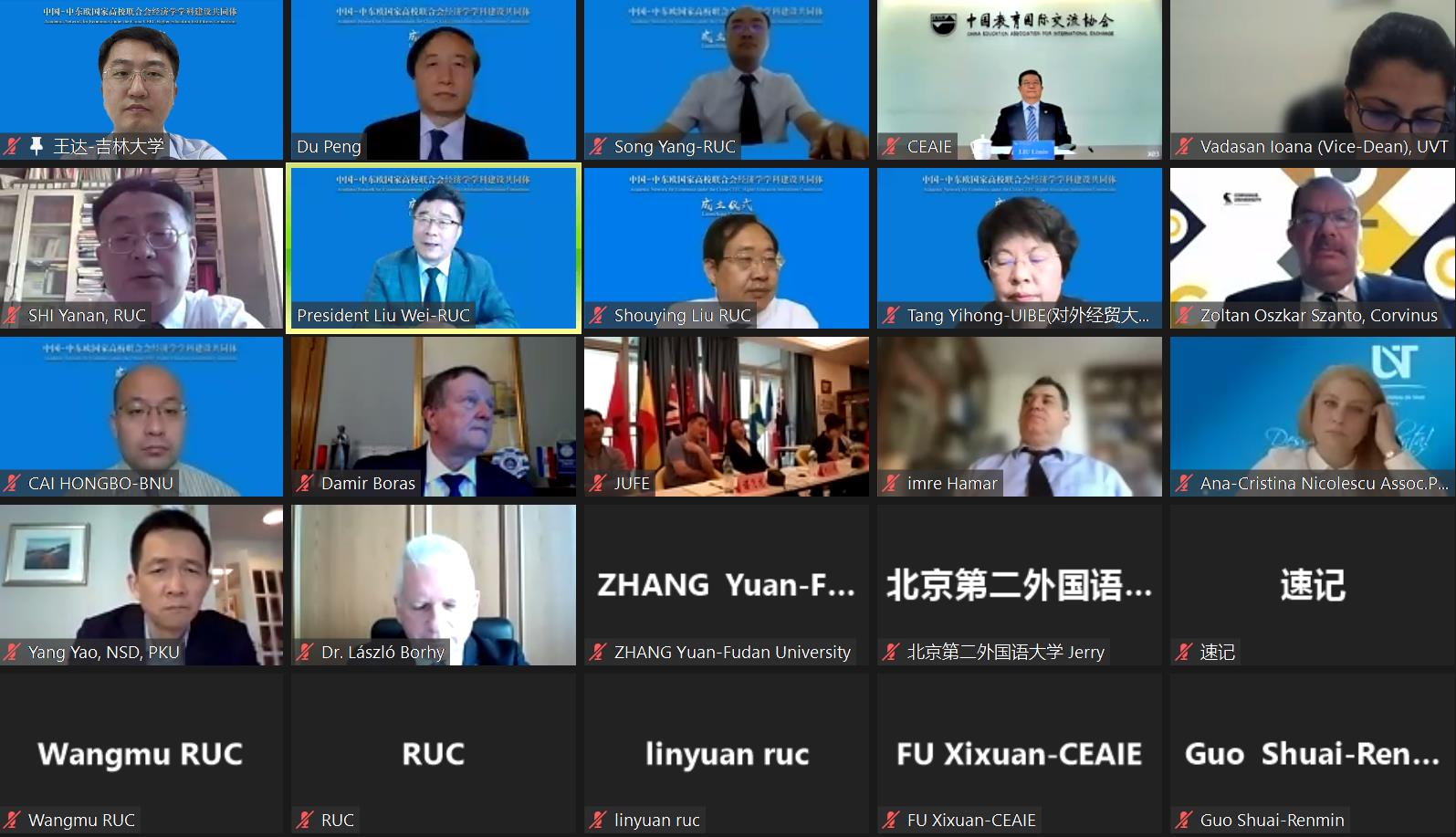 中国教育国际交流协会会长刘利民、中国人民大学董事长刘伟、匈牙利罗兰大学董事长薄慕往(Borhy László)、克罗地亚萨格勒布大学董事长达米尔·博拉斯(Damir Boras)、匈牙利卡尔文纽什大学副董事长佐尔坦·桑托(Zoltán Oszkár Szántó)等在线上出席会议并致辞,中国人民大学副董事长杜鹏主持会议。牵头单位中国人民大学w88优德经理刘守英做“共同体”筹备情况介绍,北京大学国家发展研究院经理姚洋、对外经济贸易大学国际经济贸易学院经理唐宜红代表中方发起单位致辞。中国人民大学国际交流处处长时延安、中央财经大学w88优德经理陈斌开、北京师范大学经济与工商管理学院副经理蔡洪波、w88优德副经理王达、复旦大学w88优德教授章元、中国人民大学w88优德教授宋扬、罗马尼亚蒂米什瓦拉西部大学经济与工商管理系副系主任沃道什·伊万娜(Vădăsan Ioana)、塞尔维亚贝尔格莱德大学经济系副主任萨萨·兰德洛维奇(Saša Ranđelović)等参加会议。中国-中东欧国家高校联合会成员高校代表近百人参加会议。